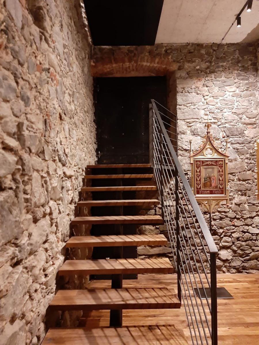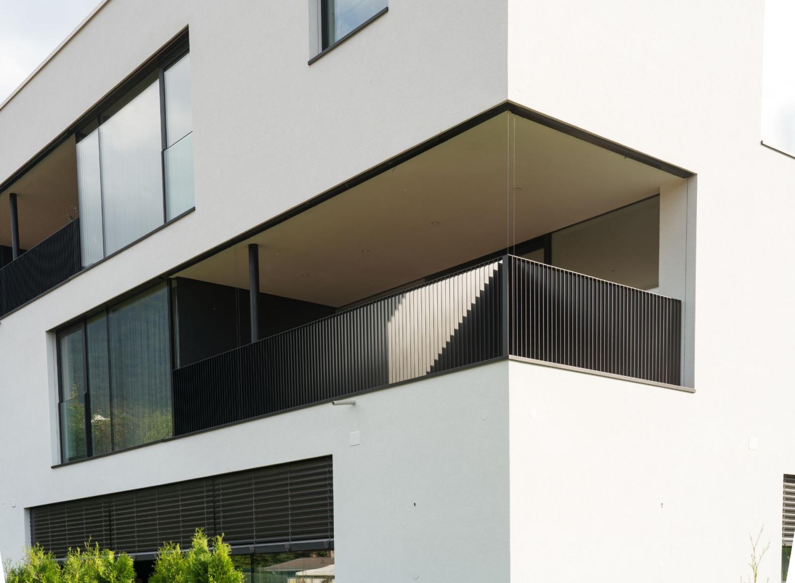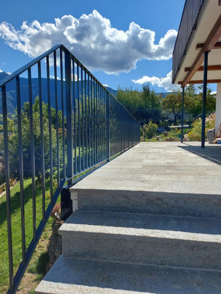 Scala esterna in acciaio nero, oliata, ringhiera con funi inox.